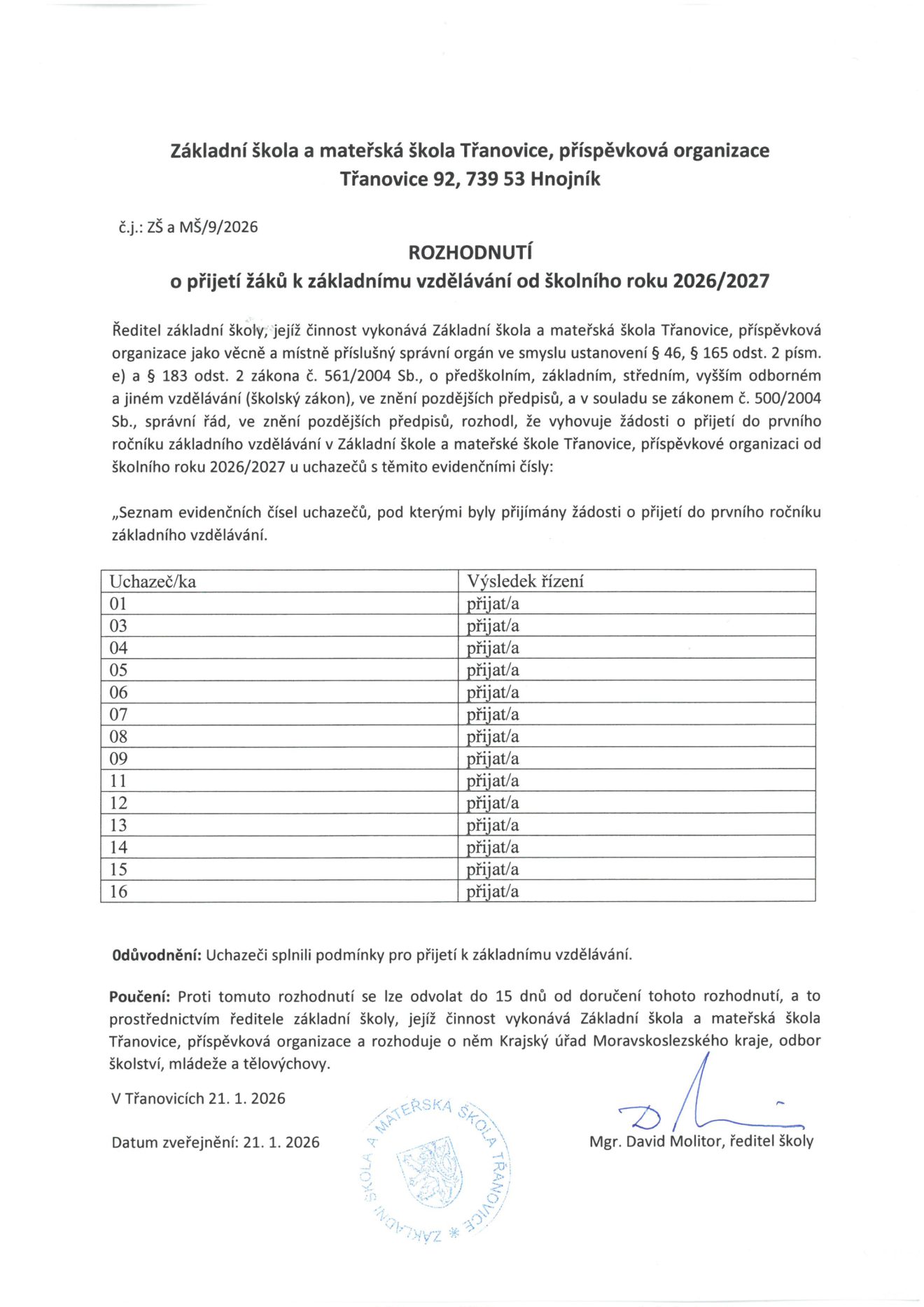 ZŠ a MŠ Třanovice > Aktuálně > Nezařazené > Rozhodnutí o přijetí do 1. ročníku Rozhodnutí o přijetí do 1. ročníku Categorized in: Nezařazené Publikováno dne: 21. 1. 2026 Datum aktualizace: 21. 1. 2026 Autor: David Molitor Skip back to main navigation
